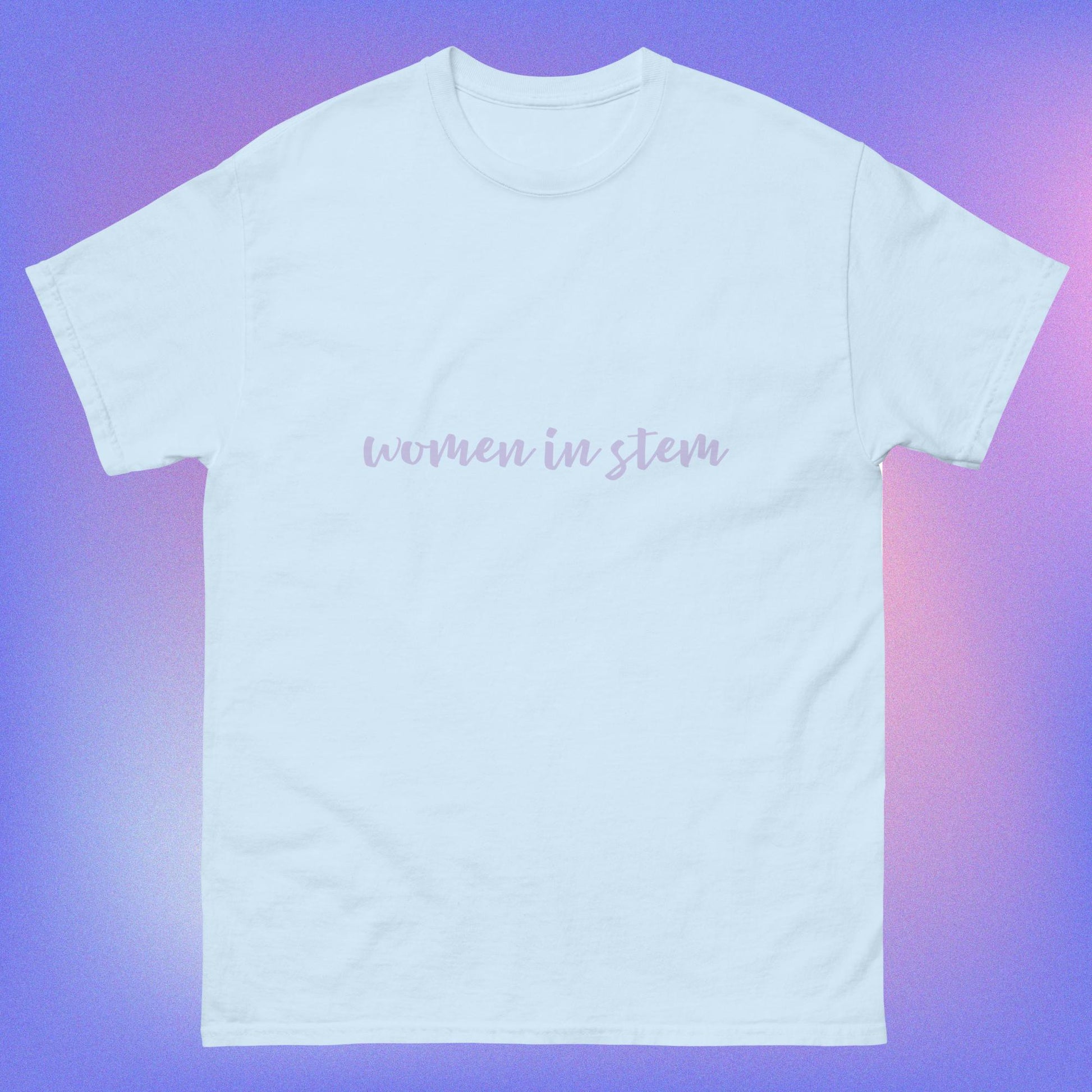 A cool minimalist 'women in stem' tshirt in the colour of your choice, including a funky light blue.