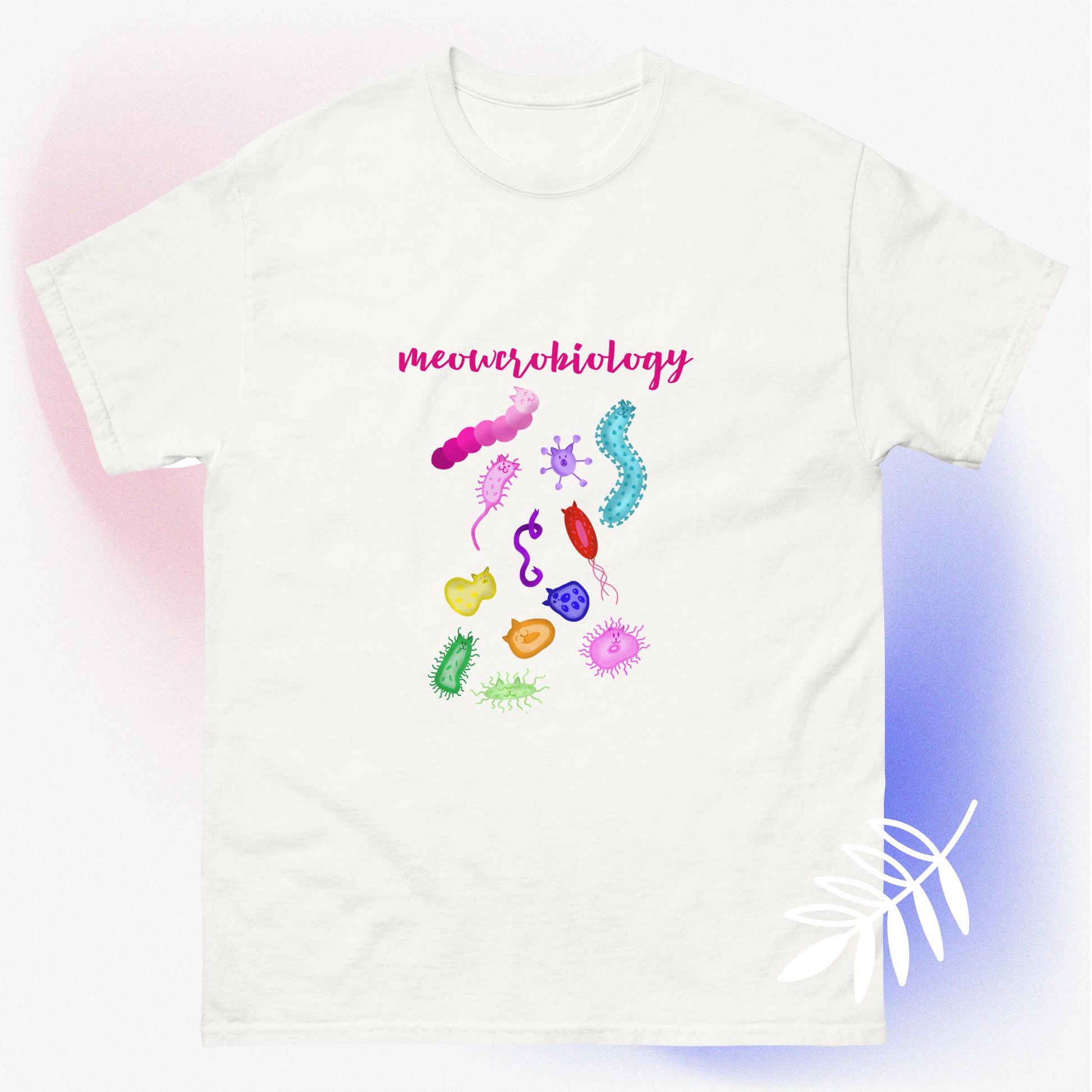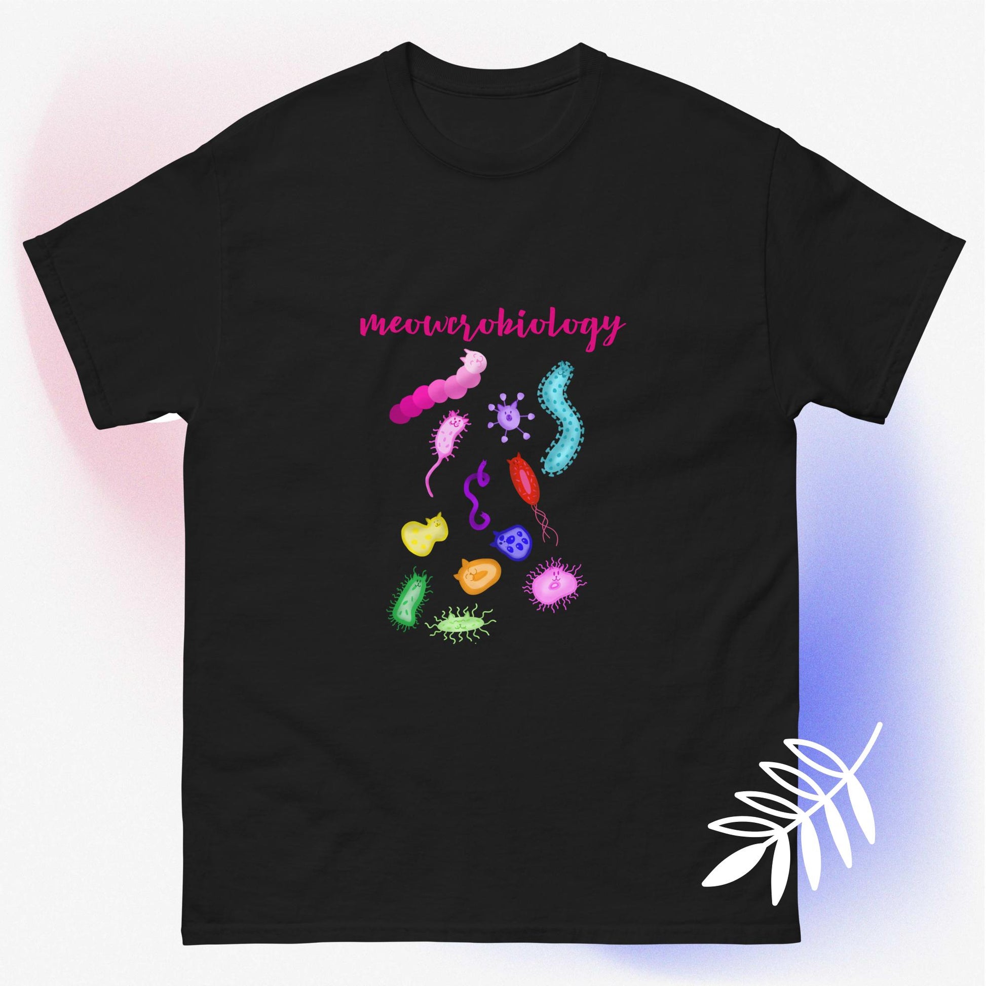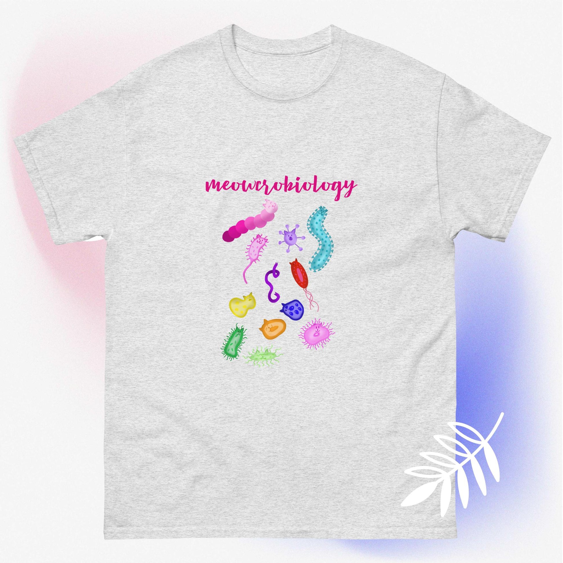 A cool unisex graphic t-shirt, featuring a funny meow-crobiology microbe design! Perfect for lovers of cats and science. All designs are made by us at STEMily Shop, and we reserve the rights to these.